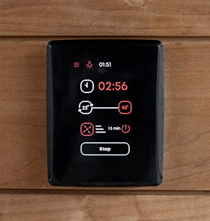 Das Steuerpult ermöglicht eine einfache Steuerung von Temperatur, Luftfeuchtigkeit und anderen Einstellungen für ein optimales Saunaerlebnis.